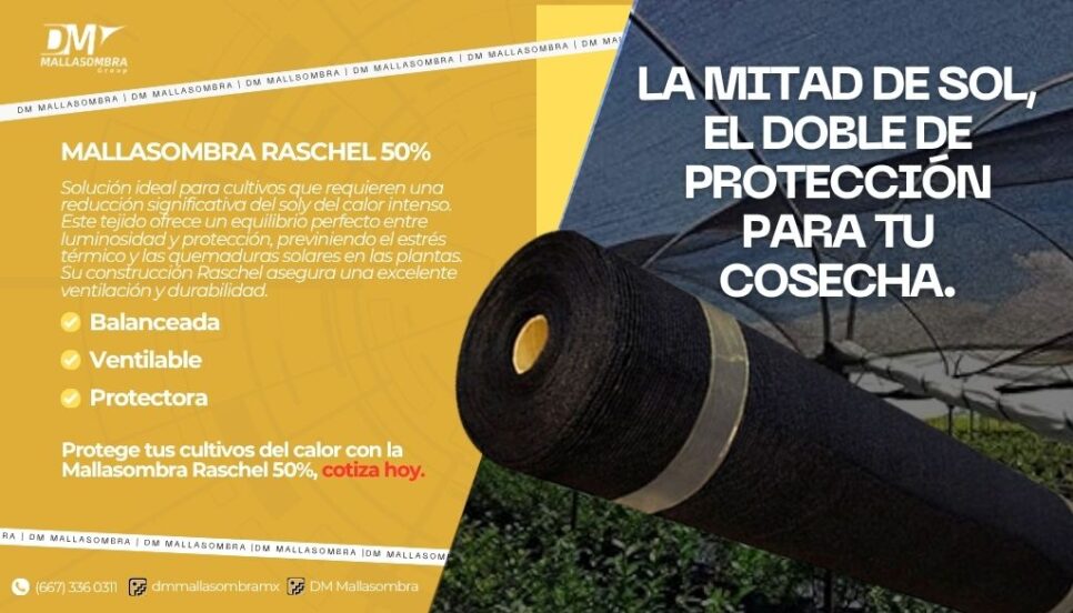 Para obtener mejores resultados en nuestros cultivos es necesario implementar mallas agrícolas especializadas como la Mallasombra Raschel 50% confeccionada a la medida para uso agrícola, ésta malla se trata de una herramienta esencial para brindar sombra y existen distintos niveles dependiendo de la necesidad del cultivo. Los porcentajes varían en el uso agrícola desde un 35% sombra hasta un 80%.